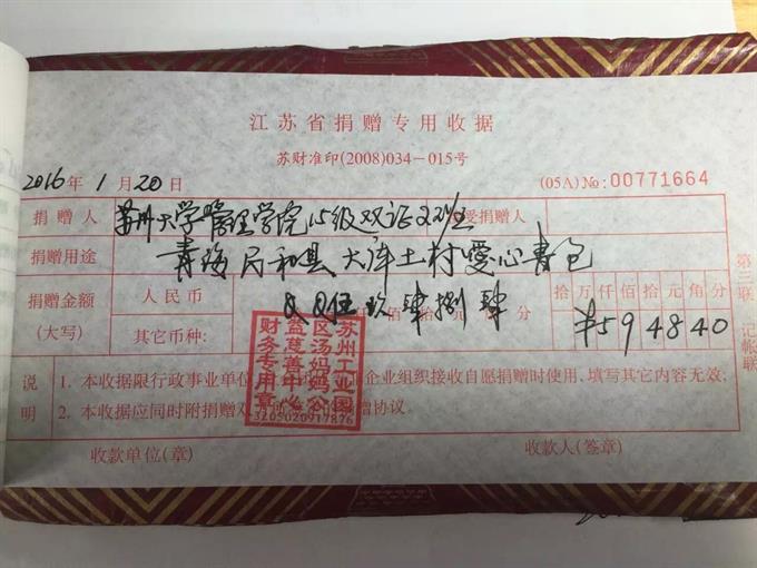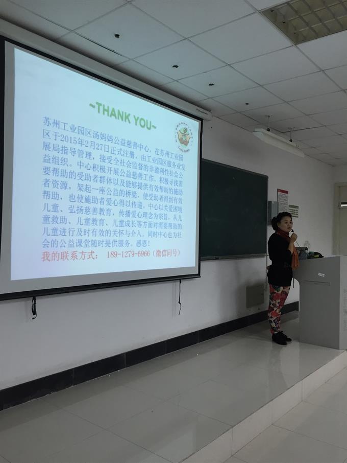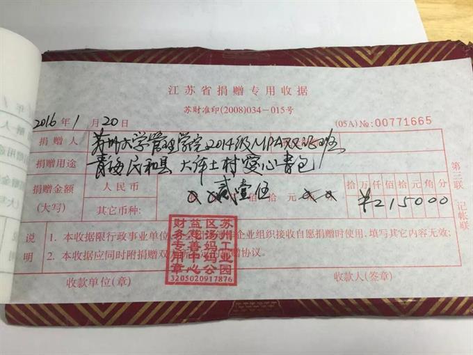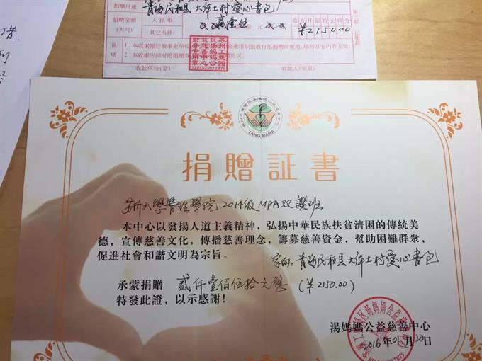 2015年12月27日,在13级MPA双证班陈丽艳同学的牵线搭桥下,我们有幸邀请到了“苏州最美家庭”的女主人、慈善达人汤妈妈——汤崇雁女士来到我们MPA课堂,汤妈妈和我们15级双证班、14级双证班的同学分享了她和她的家庭行善故事,汤妈妈和她的家人在公益慈善之路上的的艰辛、坚持、付出深深打动了我们在场的每一位同学,宣讲一结束,大家就积极响应号召,在不到一个月的时间,2014级和2015级的师生就为青海民和县大库土村的孩子们筹集爱心书包款8098.4 元。
