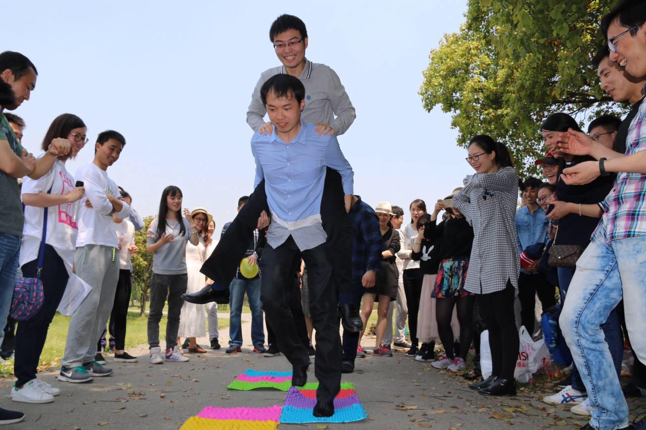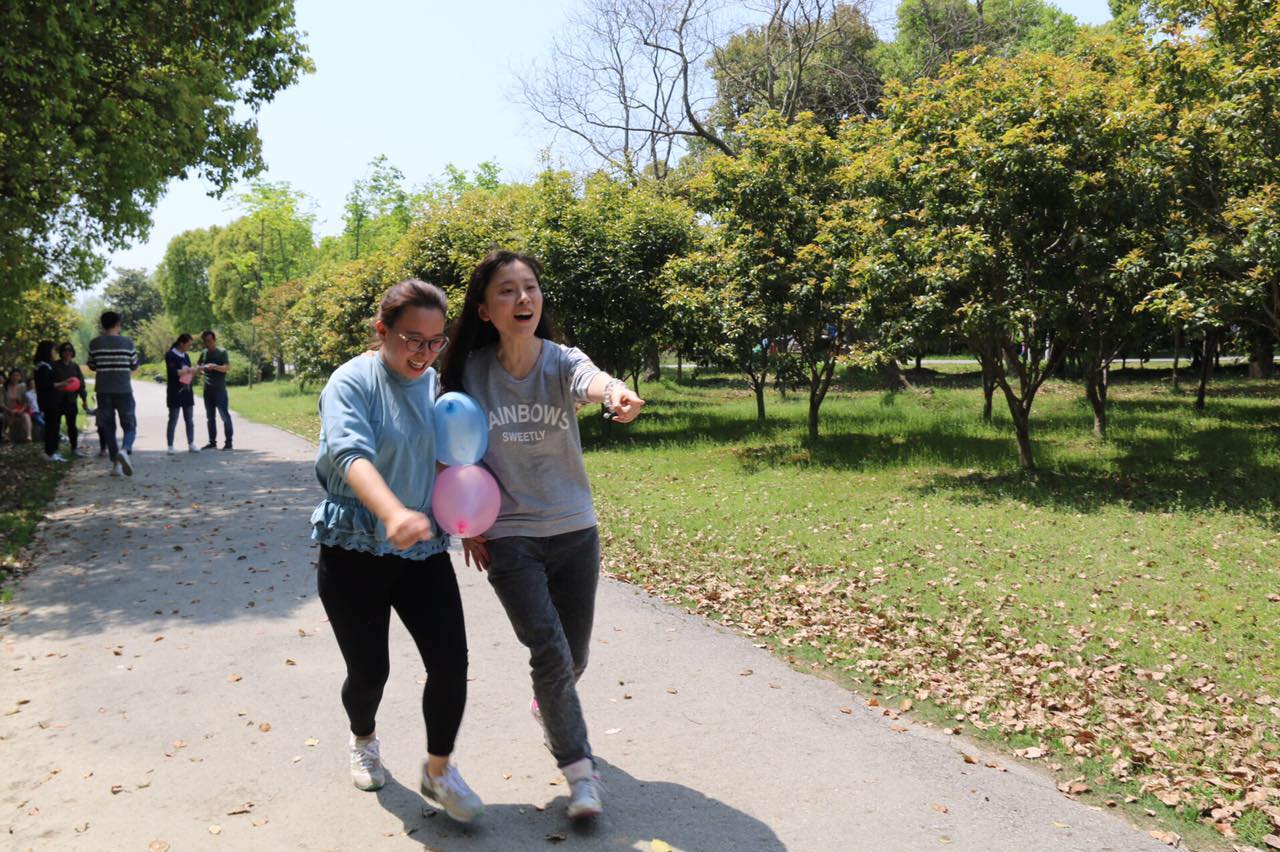 早上9点,同学们来在石湖风景区,看到在柳絮纷飞中挥舞的苏州大学2016MPA双证班班旗,同学们找到了小伙伴,大家在班旗上签下自己的名字,选出小组长,相互介绍,破冰起航。随后在主持人李冉和范佳尔的精彩主持下,同学们以小组为单位,选派实力选手,进行了“你来比划我来猜”、“一反常态”、徒步走、“夹气球”、“指压板背背”等小组比赛,一路斗智斗勇,欢歌笑语!尤其是在指压板背背中,同学们的统筹和组织协调能力得到了极致发挥,男女搭配,轻重匹配,越往后背过的次数越多,气氛紧张又热烈,在大家的加油声中,最高纪录2分钟背过了19人,引来路人纷纷围观,阵阵喝彩!