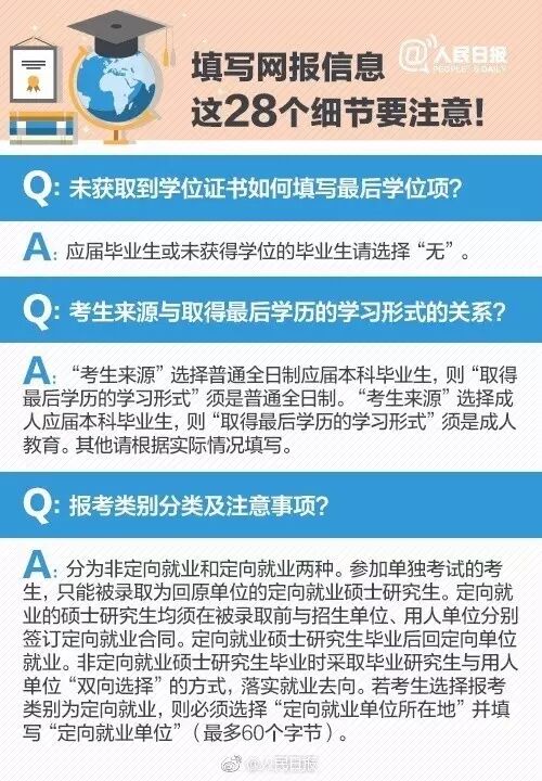 注意这28个填报细节!①9月24日至27日每天9点至22点,可网上报名;②姓名的生僻字要用拼音代替;③通讯地址是接收录取通知书的有效地址,必须准确填写;④姓名拼音最多输入80个字节的半角字符,顶格连续填写,不可有空格,大小写均可…戳图了解↓↓转给备考的小伙伴!
