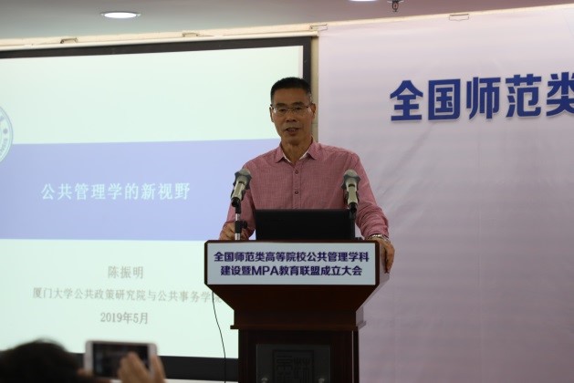 2019年5月25日,由北京师范大学政府管理学院倡议并主办,华东师范大学公共管理学院和华中师范大学公共管理学院联办的全国师范类高等院校公共管理学科建设暨MPA教育联盟成立大会在北京师范大学珠海校区国际交流中心隆重举行。北京师范大学副校长王守军,全国MPA教指委副主任委员燕继荣,全国MPA教指委委员陈振明、姜晓萍、李俊清、郑晓齐、丁煌、孙涛、孙萍、颜佳华、朱春奎、孟溦,北京师范大学副教务长兼招生办主任梁颖,华中师范大学公共管理学院院长卢新海以及来自全国设置MPA的30所师范类院校的60余位专家学者出席大会。大会由全国MPA教指委委员、北京师范大学政府管理学院院长章文光主持。