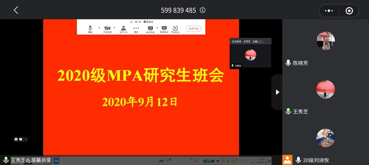 2020年9月12日晚7:30,南昌航空大学MPA教育中心召开了2020级MPA研究生线上班会。2020级MPA班主任吴红梅教授、王秀芝教授,辅导员陈晓老师芳、何声康老师,以及2020级全体MPA研究生新生参加了本次线上班会。